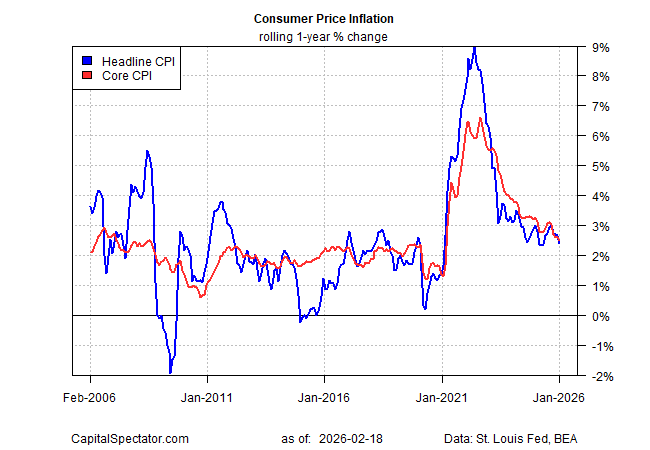It’s still too early to declare victory, but as the broad price trend continues to ease there’s a case for arguing that the worst has passed. The Capital Spectator’s ensemble forecast for core CPI has been predicting ongoing disinflation for months, an outlook that has been more or less accurate, at least so far. The model continues to see core CPI’s 1-year trending lower, slipping to 2.4% for the upcoming February report.