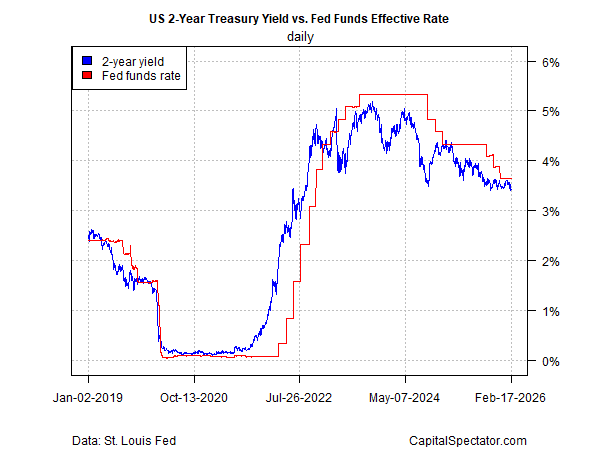 The implied forecast via Fed funds futures is still pricing in no rate cut until the June policy meeting, but the Treasury market is testing the waters for an earlier round of cutting. The policy-sensitive two-year yield is currently 3.45%, close to the lowest level since 2022 and below the Fed’s 3.50%-to-3.75% range for its target rate.