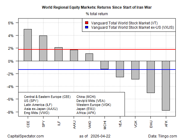 Using a set of ETFs (and one closed-end fund for Central and Eastern Europe) to track investor sentiment on a regional basis highlights a wide mix of performances since the war started on Feb. 28 through yesterday’s close (Apr. 22). Initially, stocks fell just about everywhere, but in late-March a rebound kicked in, although the recovery has been conspicuously uneven, driven in part by differences in energy vulnerability related to the sharp drop in oil exports from the Gulf region.