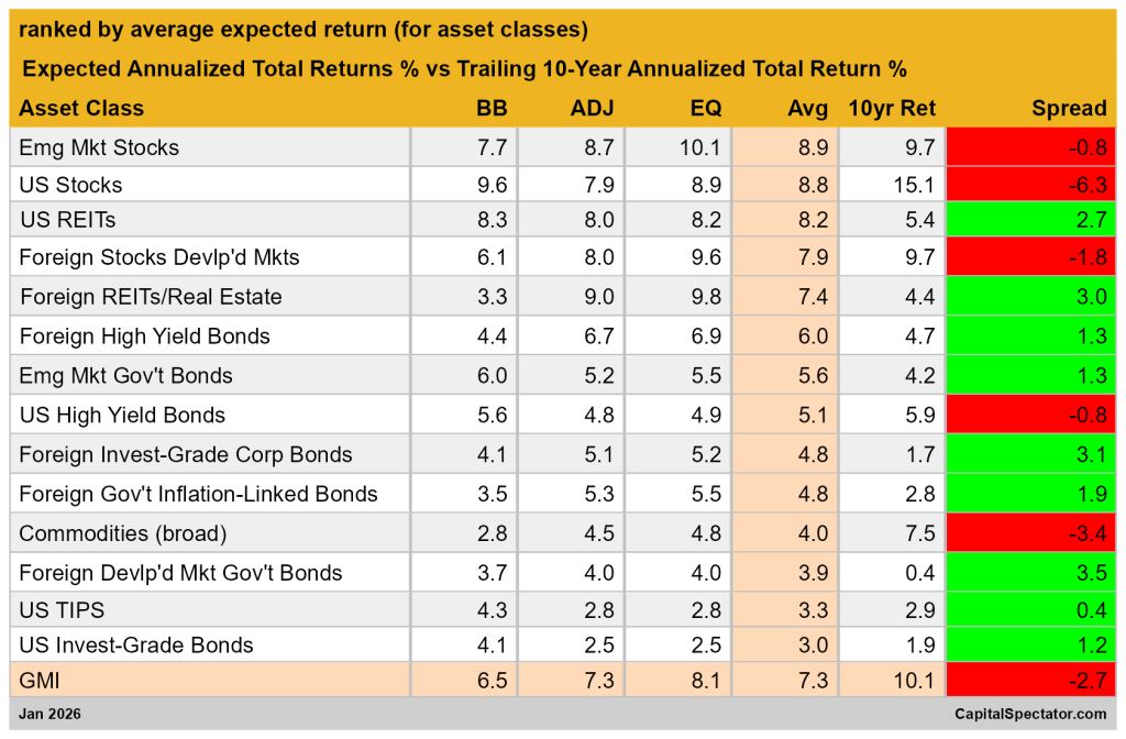 In the wake of strong gains in several markets and asset classes recently, nearly half of GMI’s components are projected to generate returns that are below results for the past ten years. Ditto for GMI, which is currently projected to earn a substantially softer return compared with its performance over the trailing ten-year window through January.